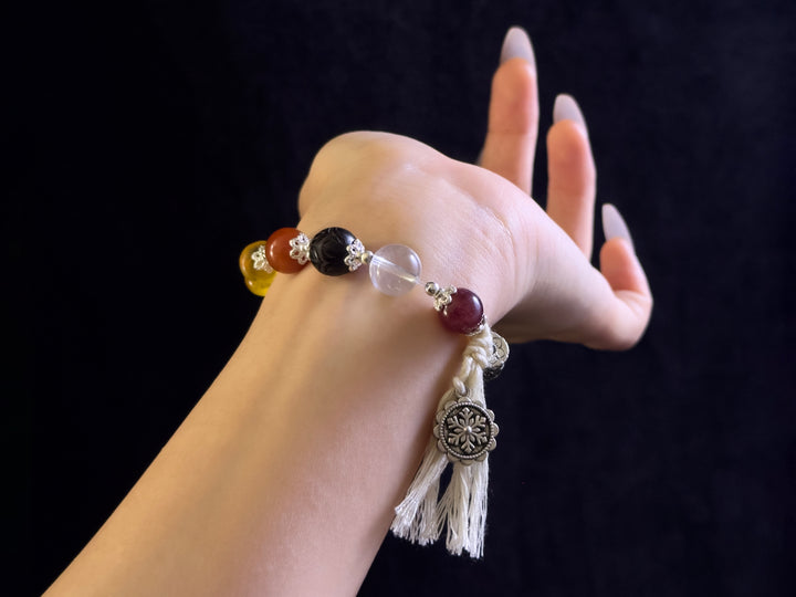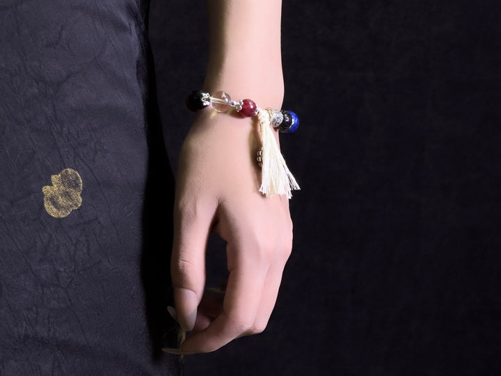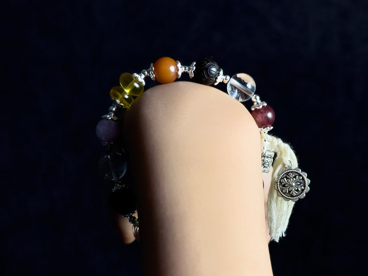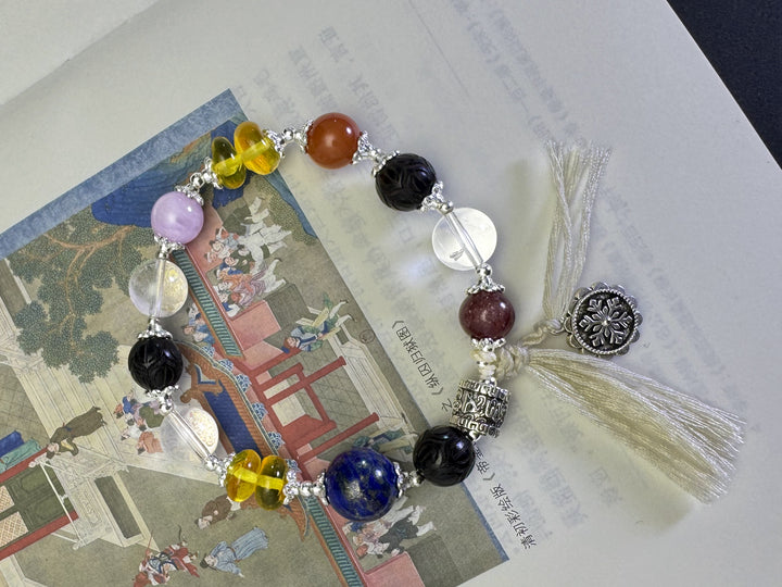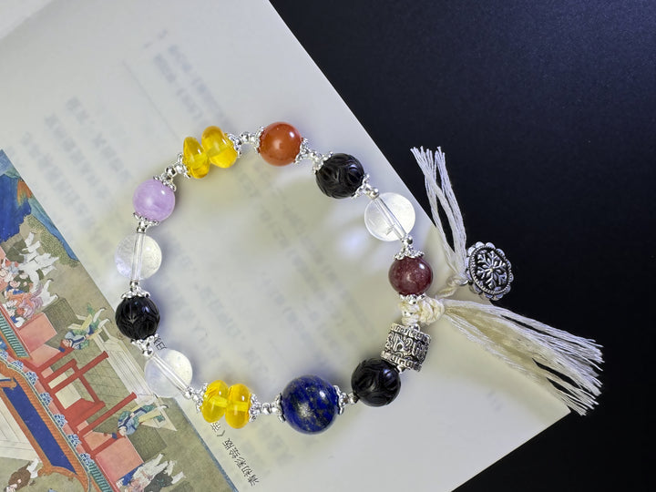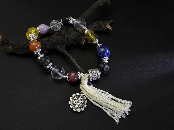 Material:Clear Quartz, Lapis Lazuli, Rose Quartz, Strawberry Quartz, Amber, Wood.